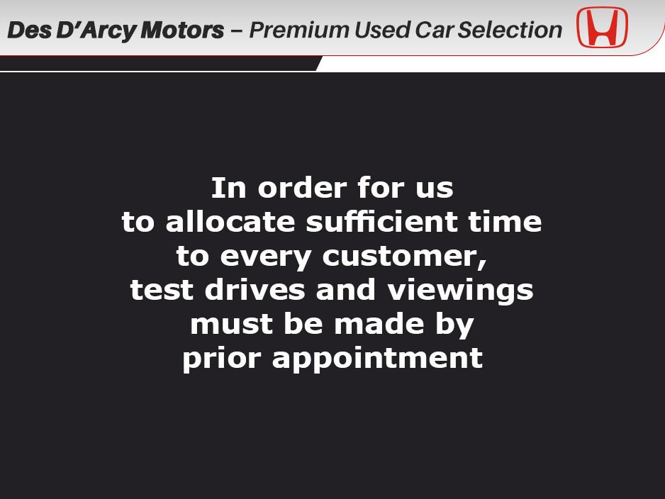 Des D'Arcy Motors Main Honda Dealer For Over 30 Years Premium Used Car Selection, If you would like to view this vehicle please phone ahead and we will have it ready for you. 12 month warranty. Free Nationwide delivery available. Central Locking, Electric Windows, Airbag, Fog Lamps, Privacy Glass, Centre Armrest, Multi-function steering wheel, Satellite Navigation, Traction Control, Metallic Paint, Anti-Theft System, Parking Sensors, Bluetooth, EBD, Isofix, Active Safety Braking / City Brake / Collision Alert, Stop/Start Button, Touch Screen Media Control, External Devices Connectivity, Cup holders, Remote boot/hatch/rear door release, Stability control